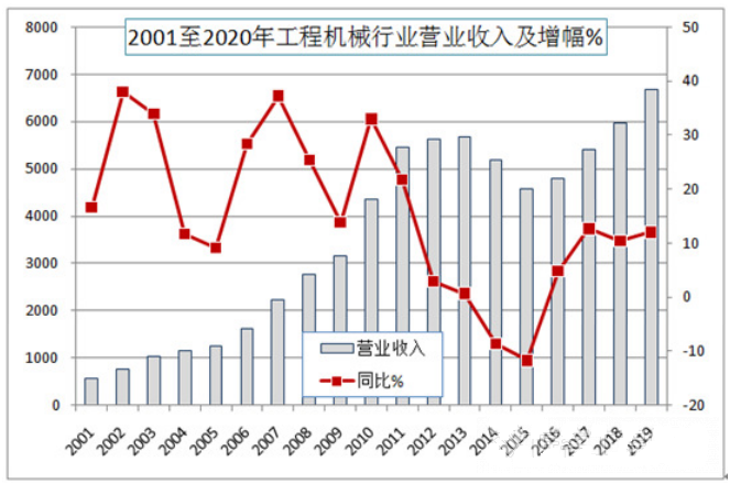 2019年,中国工程机械行业实现营收6681亿元,同比2018年增长12%,在机械制造行业排名位于前列。